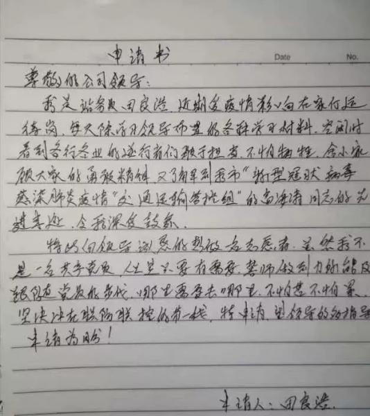 “面對(duì)當(dāng)前防疫工作嚴(yán)峻形勢,面對(duì)各行各業(yè)的逆行者們,敢于擔(dān)當(dāng),不怕犧牲,舍小家為大家的精神,面對(duì)每日忙碌在公司抗戰(zhàn)一線的同仁們,作為一名老職工,我愿奉獻(xiàn)自己的一份力量,只要有需要,我將力所能及,跟黨走,堅(jiān)決沖在抗疫第一線!2月10日下午,上善公交疫情處置工作領(lǐng)導(dǎo)小組再次收到了站務(wù)員田良浩同志的申請(qǐng)書,這是田良浩同志第二次向領(lǐng)導(dǎo)小組遞交申請(qǐng)書,在樸實(shí)無華的文字中,我們感受到了田良浩同志的決心與責(zé)任。