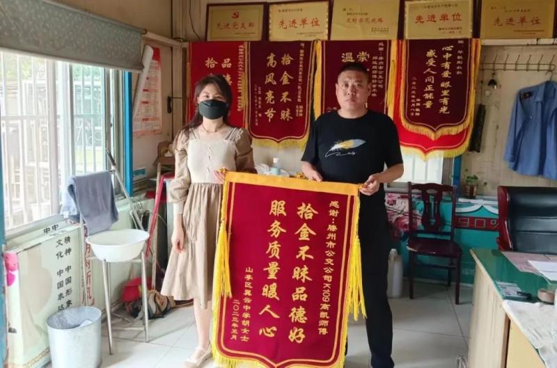 5月26日下午,市民胡女士將一面印有“拾金不昧品德好 服務(wù)質(zhì)量暖人心”的錦旗送到交發(fā)集團(tuán)公交公司一車隊(duì)辦公室,向K109路駕駛員高凱師傅表示感謝。