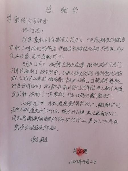4月2日下午,市民劉女士將一封感謝信送到了交發(fā)集團(tuán)交投公司,對(duì)公司工作人員熱心接力把年邁迷路的老母親送回家表示感謝。