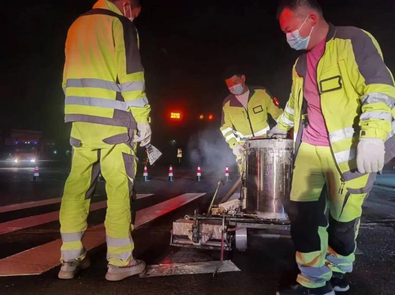 為確保白天道路交通秩序,公司施工隊(duì)伍將標(biāo)線施工安排在夜間進(jìn)行。在交通晚高峰過后,路上車流相對(duì)減少的情況下,施工人員便開始忙碌起來,設(shè)置好施工標(biāo)志和警示標(biāo)志,清除施工區(qū)域的障礙物,按照預(yù)定的劃線方案,使用專業(yè)的道路劃線機(jī)械和人工輔助進(jìn)行施工,經(jīng)過連日持續(xù)夜間奮戰(zhàn),高效完成了施工任務(wù)。